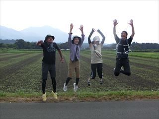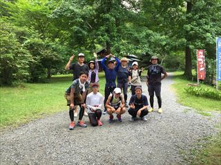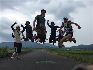 チャリ班/走り班で各々蒜山をバックに集合写真。