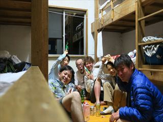 各々が50L~80Lザックのカサバリ具合と重さを自慢し合う中、